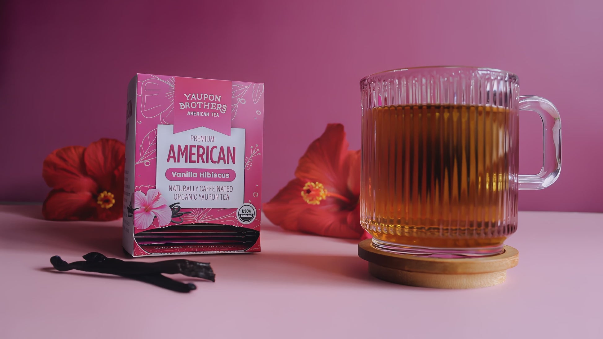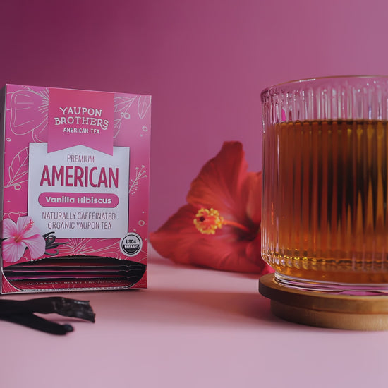 Vanilla Hibiscus Yaupon Tea blends tart hibiscus with smooth vanilla for a perfectly balanced, refreshing brew. Naturally caffeinated and made with organic, regenerative ingredients, it offers a bold yet sweet sip.